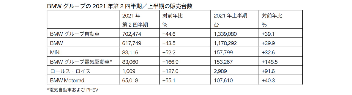 BMWグループは、2021年の上半期にBMW、MINI、ロールス・ロイスの3ブランド合計で1,339,080台(+39.1%)の車両を販売し、販売台数記録を更新した。この上半期はすべてのブランドで販売台数が増加し、同時期に世界のすべての地域で販売台数を伸ばした。BMWグループの上半期の販売台数も、コロナ禍前の2019年を上回る7.1%の増加となった。