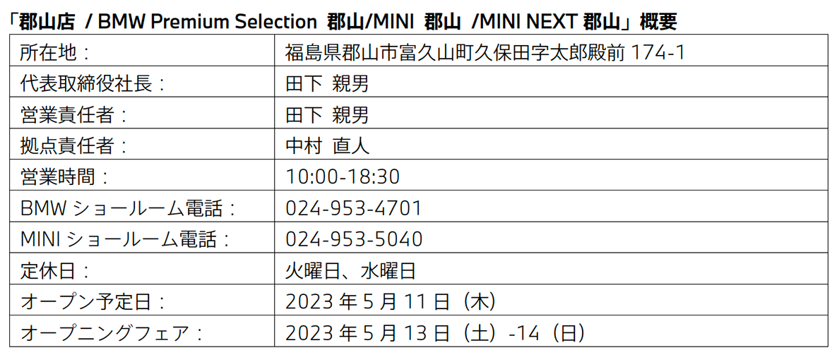 ビー・エム・ダブリュー株式会社(代表取締役社長:長谷川 正敏)のBMW およびMINI 正規ディーラーである株式会社モトーレン福島(代表取締役社長:田下 親男)は、同社の「郡山店 / BMW Premium Selection 郡山/MINI 郡山 /MINI NEXT 郡山」を移転し、本年5 月11 日(木)より営業を開始する。